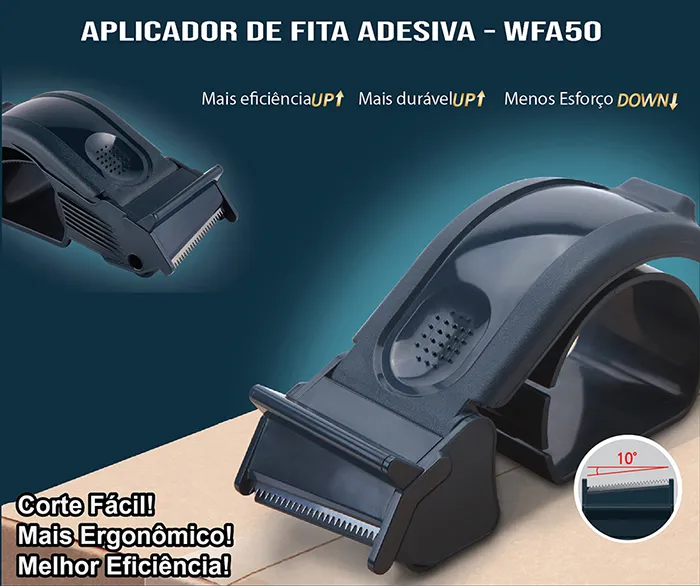O Aplicador Ergonômico WFA-50 foi desenvolvido para facilitar o uso de fitas adesivas, oferecendo conforto e precisão em cada aplicação, ideal para embalar caixas e pacotes de forma rápida e eficiente.